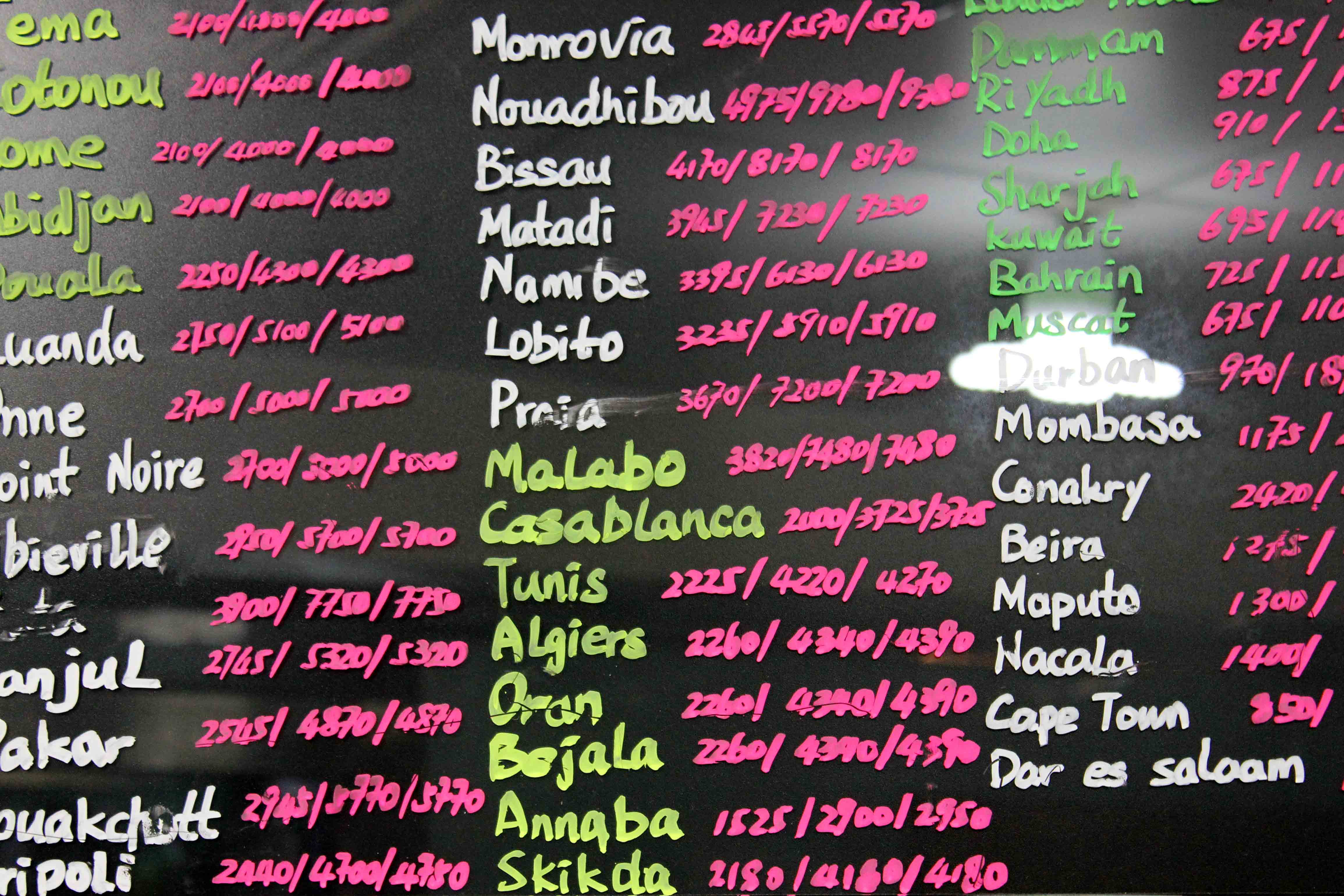Round the corner is the ‘Nanini Forward Freight’ office. A noticeboard lists prices for shipping to Abidjan, Libreville, Tripoli, Cape Town, Maputo. I tell the Chinese girl at the computer I’m just looking, but she smiles, invites me in. She must be in her early twenties, but – dressed in a patterned skirt, leggings and trainers – she looks younger.