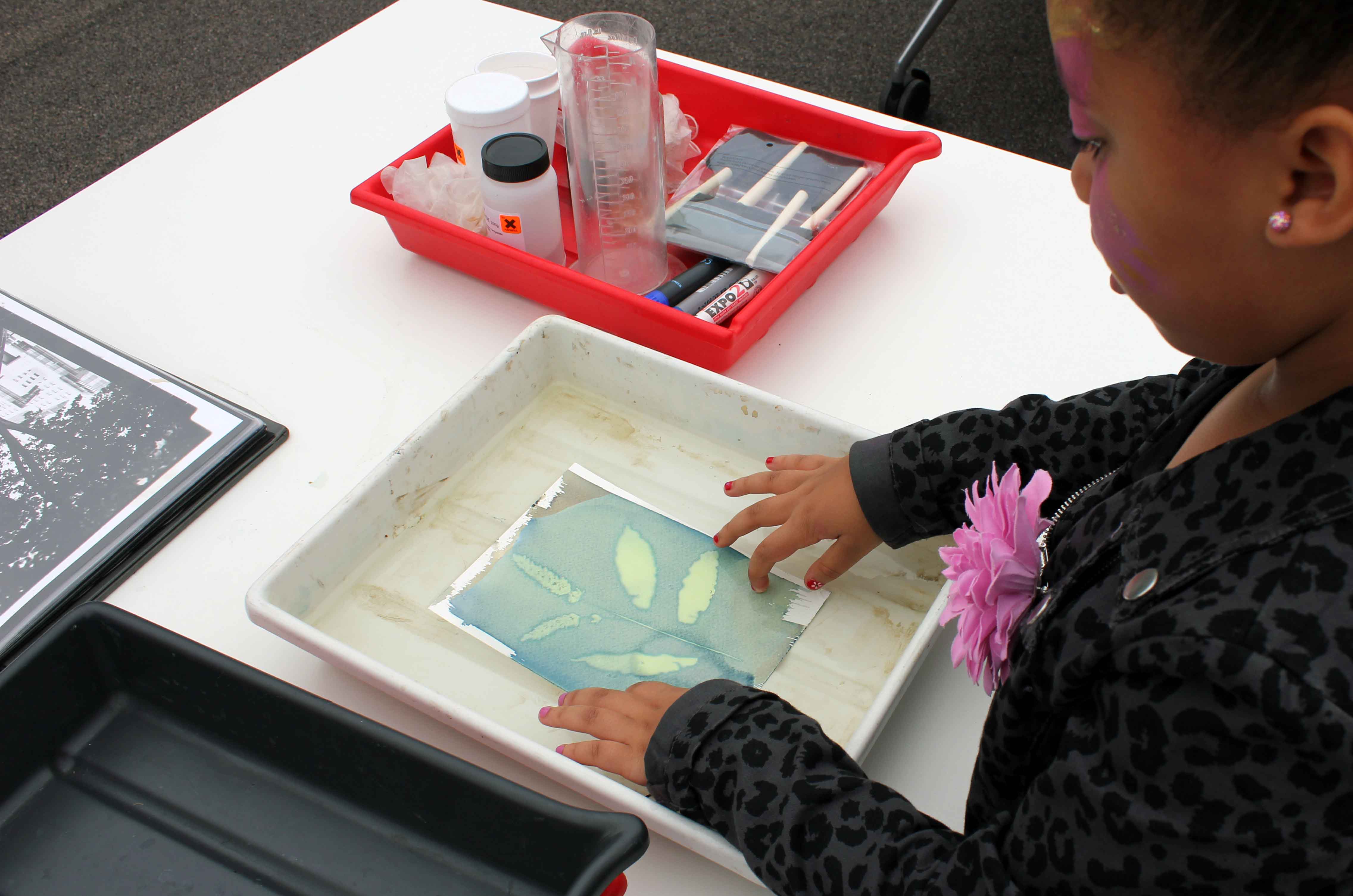 Outiside, it was a bit harder to convince people to get stuck in. The beauty of cyanotype, though, is that anyone can do it. Choose your image from the selection of negatives, place it on the treated paper, and leave it to expose under the sunlight (or cloud, in our case). When it’s ready, wash it in cold water, and hang it out to dry. (For a more detailed explanation of how the process works, read this.) You create a unique piece – you never know exactly how it will turn out; timing, daylight and the exact mix of chemicals will all affect the end result.
